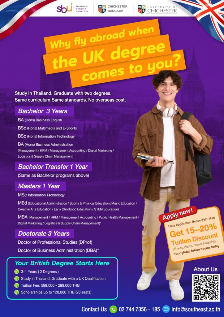 มหาวิทยาลัยเซาธ์อีสท์บางกอก (Southeast Bangkok University: SBU) ร่วมกับ University of Chichester – UK เดินหน้าสร้างโอกาสทางการศึกษาในระดับนานาชาติ เนื่องในโอกาสครบรอบ 26 ปี ของการก่อตั้งมหาวิทยาลัย SBU ด้วยการมอบ ทุนสนับสนุนการศึกษาสูงสุด 26 ทุน มูลค่ารวมกว่า 3 ล้านบาท เพื่อเปิดทางให้นักเรียนไทยที่มีศักยภาพ ได้เข้าศึกษาใน โปรแกรมการศึกษาหลักสูตรนานาชาติสองปริญญาไทย–อังกฤษ ที่พัฒนาร่วมกับสถาบันการศึกษาจาก สหราชอาณาจักร